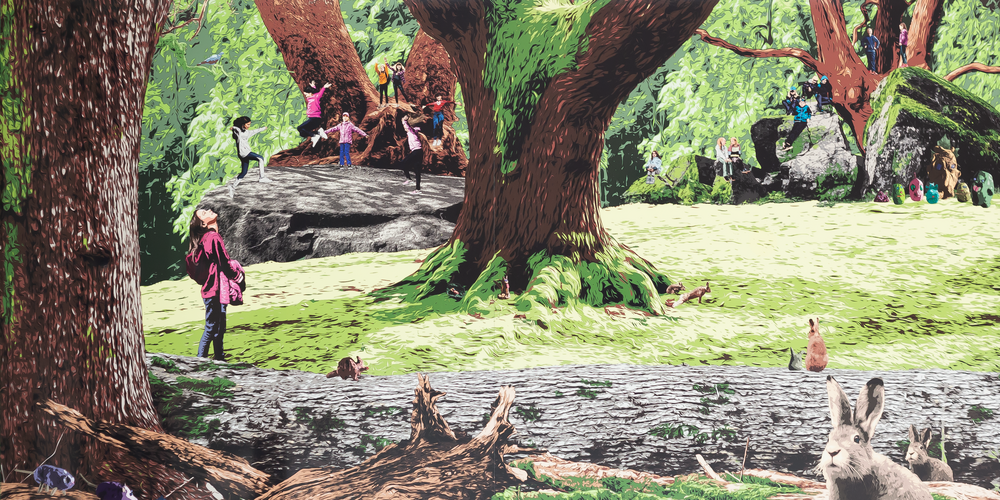 Toivon pihalle yhtä aikaa rauhallista, kiehtovaa ja innostavaa tunnelmaa – sellaista tunnelmaa, jota ihanassa metsässä voi tuntea. Siksi tasaiselle pihalle on tärkeää saada maastonmuotoja, vihreyttä ja luonnonelementtejä. Lisäksi haluan luoda lapsille koulupihan omia hahmoja/henkiä, joihin voi tutustua ja joita nimetä ja kokea seuralaisikseen.