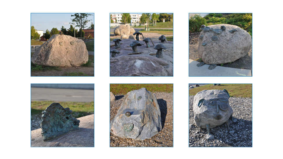 Ehkä pronssi kasvaa kiveen kuin jäkälä. Kivestä työntyy korvia, häntiä, neniä. Kivi saa silmät. Laakean kiven päälle nousee sieniä, toisaalle talo. Yksi itkee, koska sitä on kiusattu. Toisella on kruunu, kolmannella terävät hampaat, neljännellä suuret tassut. Kivet seisovat aloillaan, niillä on kaikki aika katsoa silmiin ja kuunnella. Nämä kivet on löydetty luonnosta, josta ovat tuotu osaksi tätä pihaa ja sen leikkejä. 75 tämän koulutalon suomen- ja ruotsinkielistä oppilasta, 75 silmäparia, 150 kättä, muovasi näille kiville savesta persoonan työpajoissani kuumana loppukesänä 2021. Kaksi kivihahmoa on saanut kasvonsa pihan asfalttiin ketunleipien, apilan, pihlajan-, haavan- ja vanamonlehtien seuraan, sisäänkäyntien C ja D edustalle.