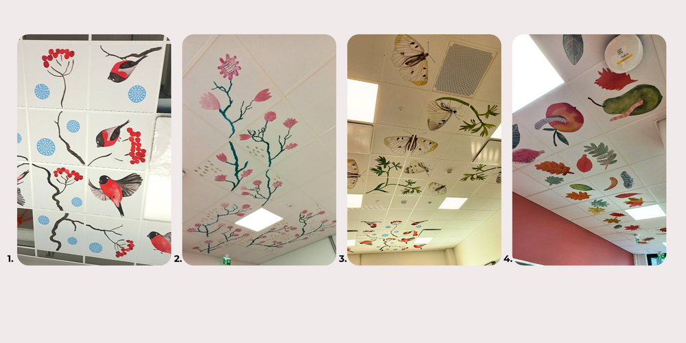 Taidetta päiväkodin sisätiloihin päätettiin toteuttaa ruokailutilan kattoon sekä neuvottelutiloihin. Ruokailutilan taiteelle avattiin teoshaku syksyllä 2024 ja tekijäksi valikoitui kuvataiteilija Meri-Pauliina Sundén. Sundénin teoskokonaisuus asennettiin huhtikuun alussa 2025. Neuvottelutilaan sekä henkilökunnan taukotilaan hankitiin taidetta jälleen suoratilauksena taiteilijoilta. Tässä kantavana ajatuksena oli olemassa olevan taiteen hyödyntäminen. Neuvottelutilaan hankittiin teos valokuvataiteilija Andréa Vannucchilta ja henkilökunnan taukotilaan kaksi teosta kuvataiteilija Sini-Meri Hedbergiltä.
