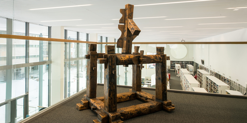 Jarkko Rothin musta dioriittiveistos sijaitsee Kaarina-talon lehtilukusalissa, vasten punaisen sisääntulokuution seinää.