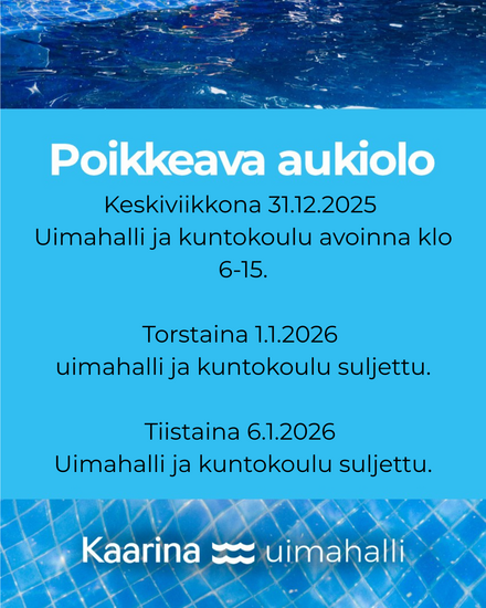 Huom! Uimahalli ja Kuntokoulu ovat suljettuina loppiaisena 6.1. Torstaina 8.1. avaudumme vasta klo 12, kun hallilla on koko henkilökunnan koulutus.