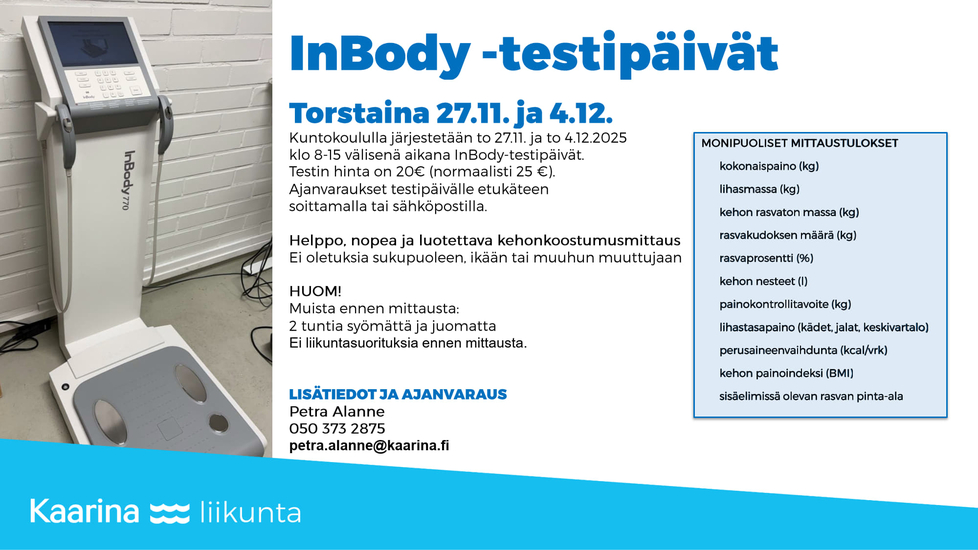 Kuntokoululla järjestetään torstaina 27.11. ja 4.12.2025 klo 8-15 välisenä aikana Inbody-testipäivät. Testin hinta on 20 euroa. Normaalisti hinta on 25 euroa. Ajanvaraukset testipäivälle tulee tehdä etukäteen joko soittamalla tai sähköpostilla.