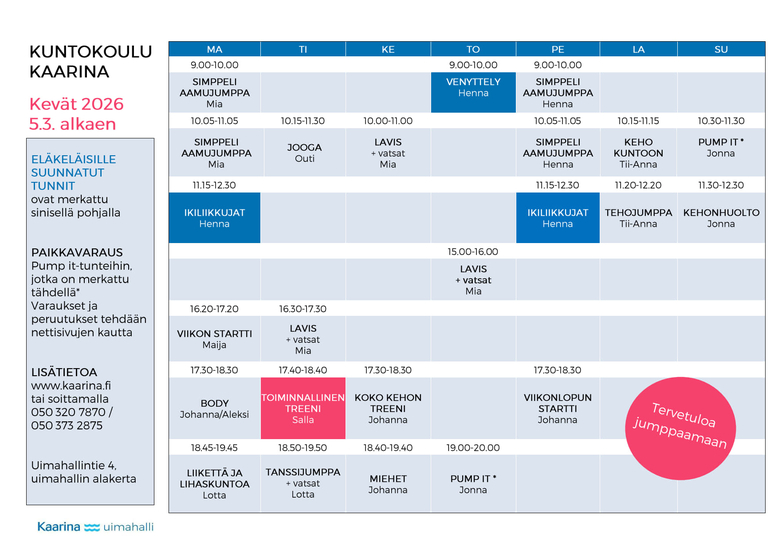 Osa jumpista paikkavarauksella. Paikkavarauksella olevat jumpat on merkitty tähdellä *. Muistathan varata paikkasi tunnilta nettisivujen kautta.