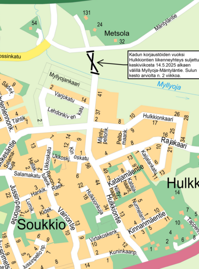 Kadun korjaustöiden vuoksi Hulkkiontie joudutaan sulkemaan kaikelta liikenteeltä välillä Myllyoja-Mäntyläntie keskiviikosta 14.5.2025 alkaen. Sulku kestää arviolta 2 viikkoa.