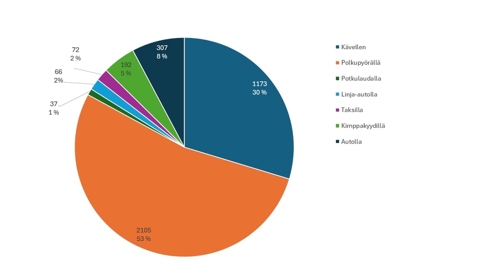 Haastekisaviikon aikana valtaosa koulumatkoista, eli 84 prosenttia, tehtiin lihasvoimin. Suosituin liikkumistapa oli pyöräily: koulu- ja kotimatkoista tehtiin pyörällä 53 prosenttia. Toiseksi suosituin kulkutapa oli kävely 30 prosentin osuudella. Lisäksi yksi prosentti matkoista tehtiin potkulaudalla.