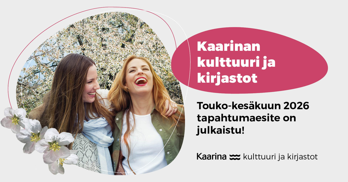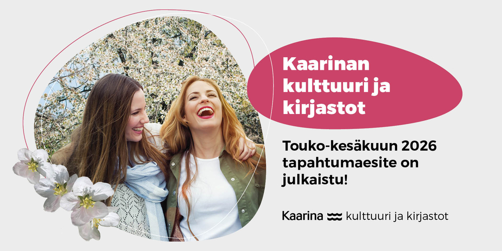 Voit tutustua kulttuuri- ja kirjastopalveluiden tapahtumatarjontaan uudesta esitteestä, jota voit selata täällä: kaarina.fi/tapahtumat-touko-kesa-2026 tai käydä nappaamassa esitteen käteesi vaikkapa Kaarina-talosta tai Piikkiön kirjastosta.