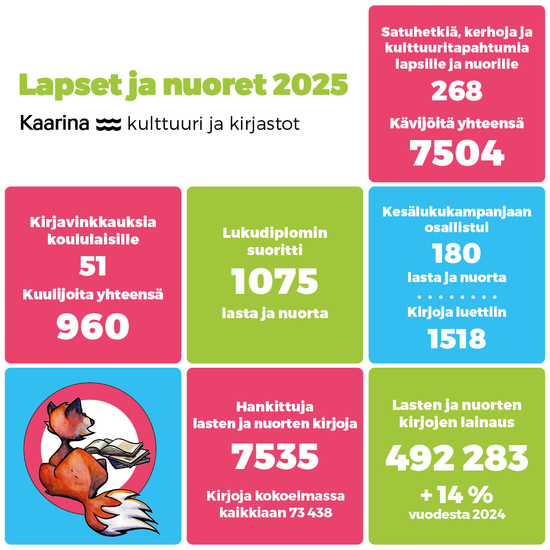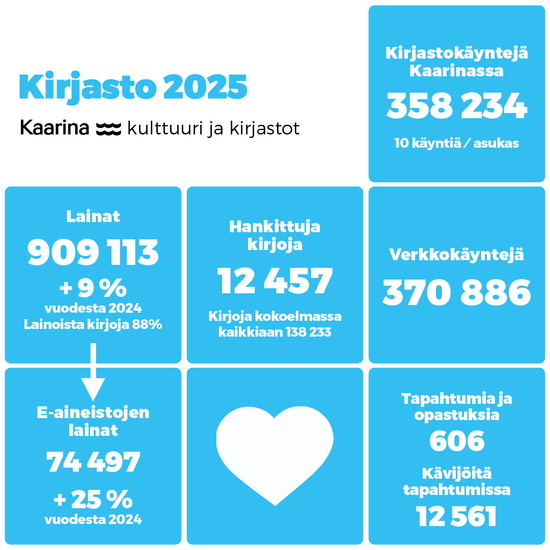 Kaarinan kulttuuri- ja kirjastopalveluissa vuosi 2025 oli ennätyksellisen vilkas erityisesti lainamäärien osalta. Vuosi oli täynnä lukuintoa, kohtaamisia ja yhteisiä elämyksiä. Kulttuuritapahtumat puolestaan keräsivät yli 19 000 kävijää.