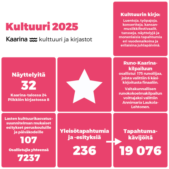 Kaarinan kulttuuripalveluiden tapahtumavuosi 2025 oli monipuolinen. Vuosi piti sisällään mm. konserttisarjan upeat musiikkielämykset, perinteisten juhlapäivien tapahtumat ja uusia tapahtumakokonaisuuksia kuten vauva- ja käsityökinoja. Vuoden aikana tapahtumiin osallistui yli 19 000 kävijää.