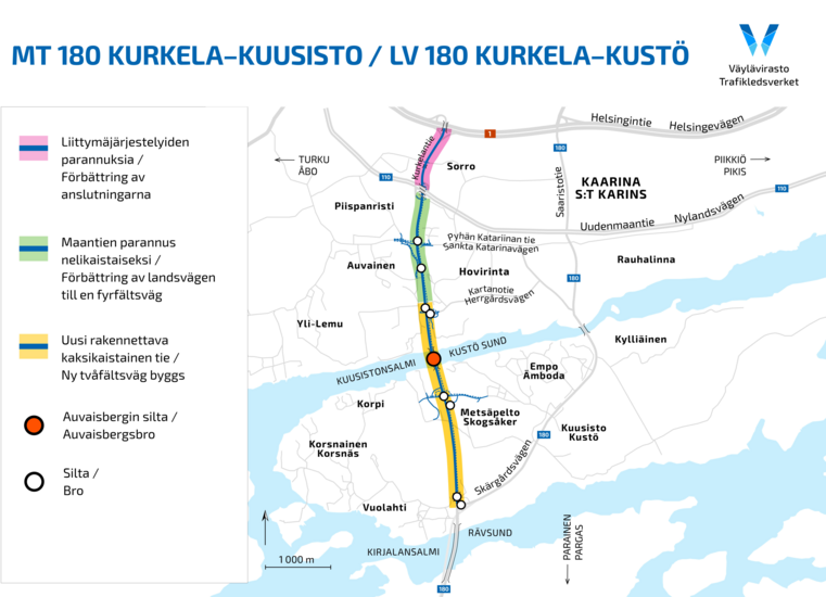 Mt 180 Kurkela-Kuusisto-hankkeen keskeinen tavoite on seudullisen tieyhteyden sujuvuus ja turvallisuus. Hankkeessa toteutettavilla tie- ja liittymäjärjestelyillä parannetaan liikenteen sujuvuutta ja liikenneturvallisuutta. Samalla myös tuetaan Kaarinan kaupungin yhdyskuntarakenteen ja maankäytön kehittämistä. Hankkeessa rakennetaan uutta tietä maantielle 180 uuteen maastokäytävään noin 3,5 kilometriä, ja maantietä parannetaan kaksiajorataiseksi ja nelikaistaiseksi noin 1,3 kilometrin matkalta. Hankkeessa rakennetaan tai uusitaan 9 maantiesiltaa, mukaan lukien Kuusistonsalmen ylle rakennettava Auvaisbergin silta. Hankkeessa toteutetaan laajasti melusuojausta ja pohjanvahvistuksia sekä ratkaisuja kävelyn ja pyöräilyn väylille sekä yksityistiejärjestelyitä. Hankkeen kustannusarvio on 114,4 miljoonaa euroa.