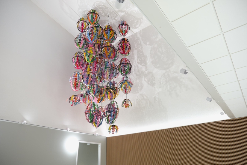Laajennusrakennuksen sisätilassa, pääportaikon yhteydessä, katosta laskeutuu Oona Tikkaojan teos Ryöppy. Teos koostuu kierrätysmetallinosista, laserleikatusta alumiinista sekä pyörän osista. Värikkäällä teoksellaan Tikkaoja tavoitteli anteeksipyytelemätöntä läsnäoloa, joka sopii hyvin nuorten koulutilaan. Vaikka teoksen nimi voi viedä ajatukset runsauteen ja voimakkaaseen liikkeeseen, se jättää myös tilaa omalle tulkinnalle.