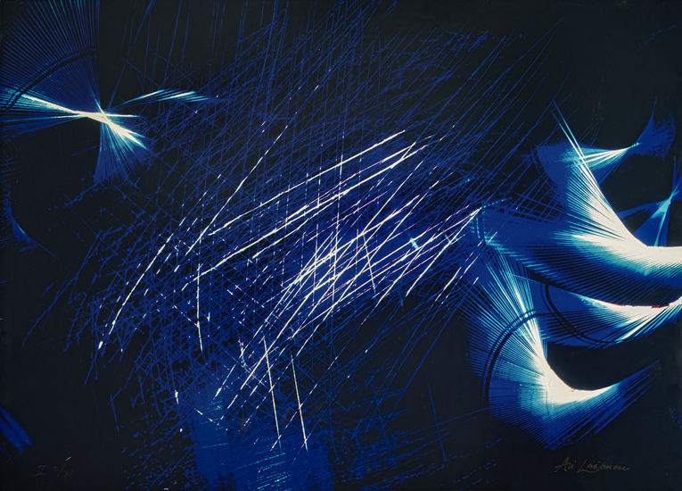 ”Ihastuin todella teoksen sinisyyteen ja syvyyteen. Mielessäni teoksen valkoiset säteet muodostavat linnun hahmoja, jotka ovat kokoelman kannalta merkittäviä. Mietin myös, mistä säteet tulevat ja läpäisevätkö ne maan vai tulevatko jopa maasta”, kertoo Laukola-Lehtonen.