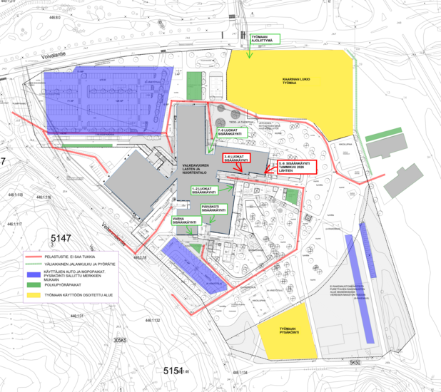 Valkeavuoren kampuksen rakennustyöt ovat valmistuneet ja kampuksen urakkaan kuuluvat piha-alueet on saatu kokonaisuudessaan käyttöön. Alueella on kuitenkin edelleen Kaarinan lukion työmaasta johtuvia tilapäisiä liikennejärjestelyjä. Tämän vuoksi vaaditaan ohjeiden noudattamista ja muiden huomioimista, jotta kaikki voivat liikkua kampuksen alueella ja ympäristössä turvallisesti. Muutokset on merkitty alla lihavoituna tekstinä.