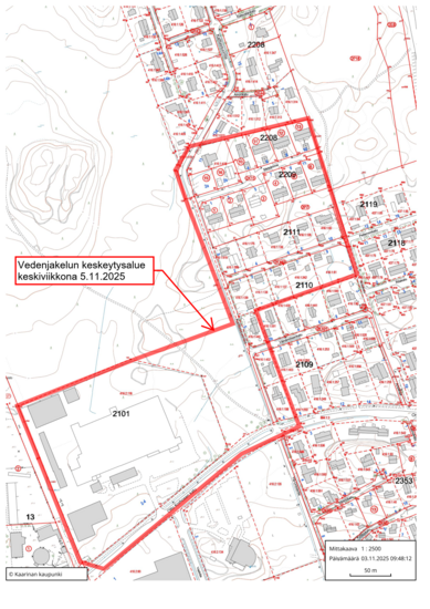Kaarinan kaupungin Vesihuoltolaitos ja Finaco Oy/Rakenneverkko Oy tekevät Kalttassuon saneerauksen yhteydessä vesihuollon liitostöitä keskiviikkona 5.11.2025. Työt aiheuttavat vedenjakelun keskeytyksen arviolta klo 09.00–17.00. Keskeytysalue on kuvattu alla olevassa kartassa.